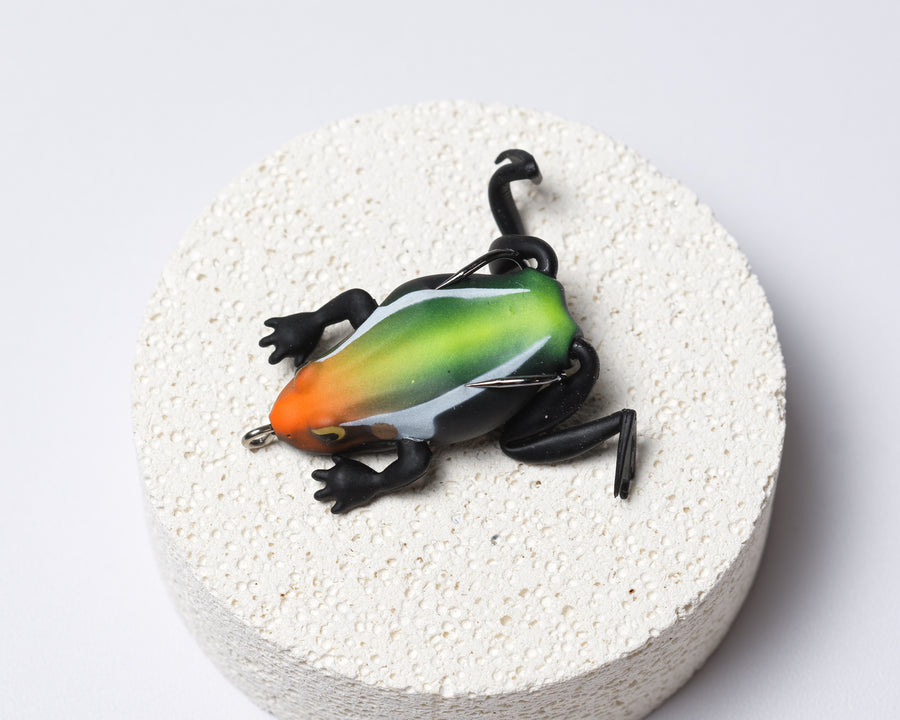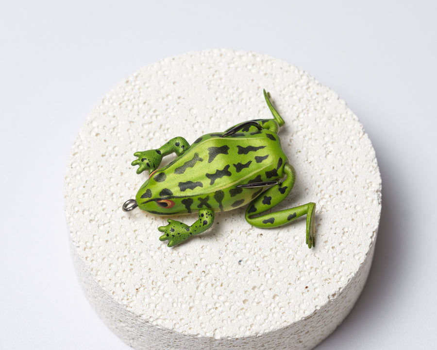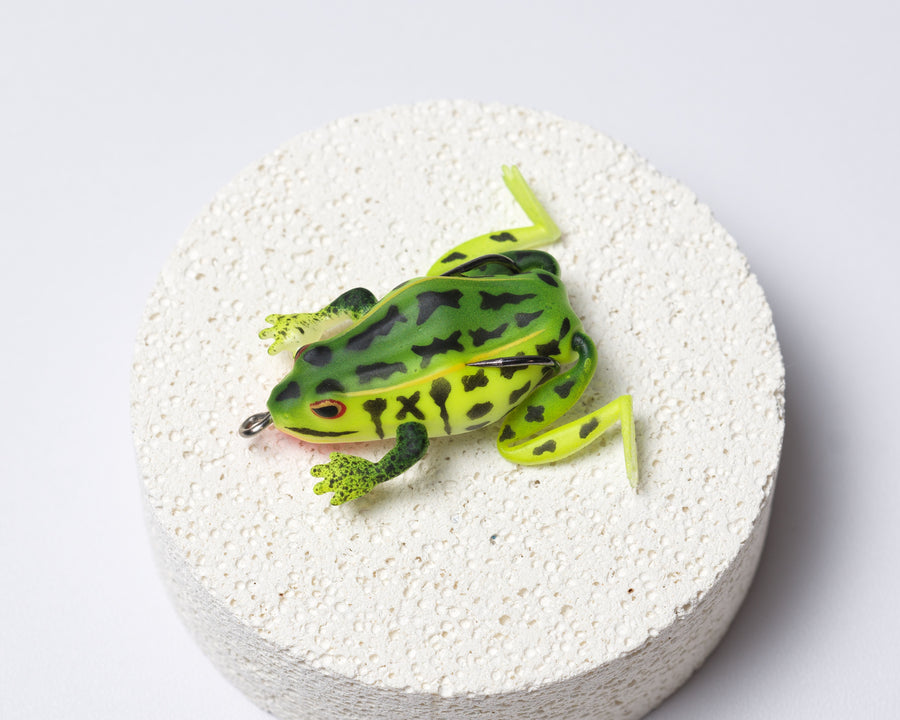 The FAISOX Hop Frog is one of the most lifelike frog lures on the market today. Designed to mimic a young frog, its swimming legs extend during the retrieve and retract when paused, just as a real frog would move. At rest, it measures 1.97 / 2.56 inches, extending to 3 / 3.6 inches during the retrieve, with its body dipping slightly into the water to replicate the natural action of a frog or bullfrog. This realistic movement leads to higher hookup rates. Additionally, the FAISOX Hop Frog is built with premium components, a super soft hollow body, and a weedless design.